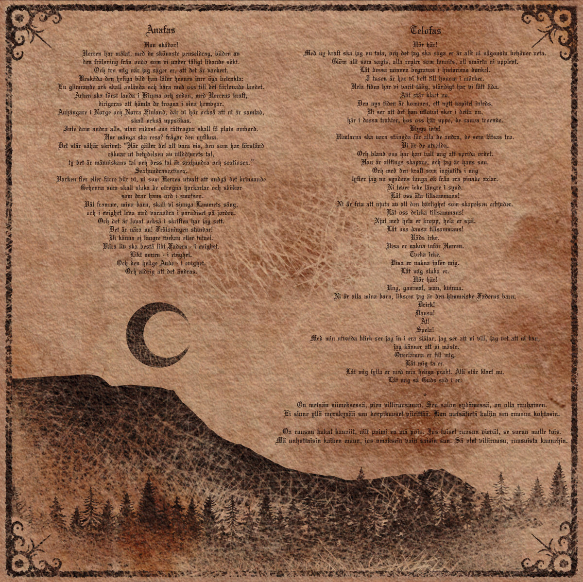 Almost 100 years after its formation, the movement was now brought back to life with followers from its authentic regional cradle, musically substantiated in the adequate form of black metal. „Är du av den rätta tron“ („Are you of the right faith?“) is a professional soundtrack production to an avantgarde theatrical extravaganza that’s been performed in Sweden anywhere from outdoor markets to royal state theaters since 2021 and is designated for premieres across the rest of Europe. The concept is modeled after a religious mass featuring a full metal band. The lyrics chronologically deal with the history, the gospel and the speculative arrival of the cult’s prophecies and are versatilely accompanied by a wide range of musical means: sepulchral preachings of the prophet answered by his screaming disciples are accompanied by ambient synth-scapes and analog experimental noise, only to be interrupted by the rawest scandinavian black metal mixed with old-school death/thrash cannonades, before everything gives way to an infernal pagan metal heresy based on a Finnish folk song.